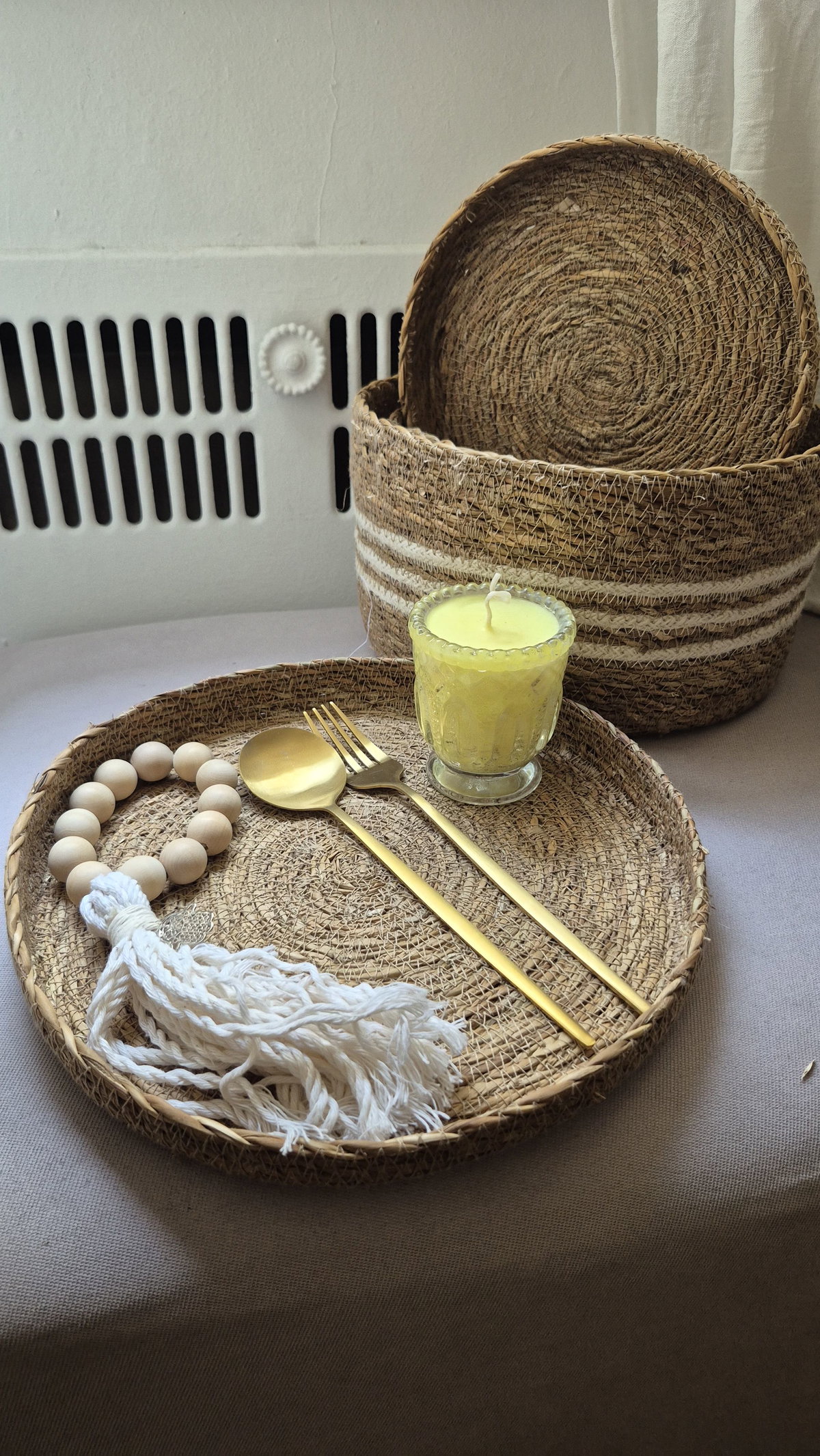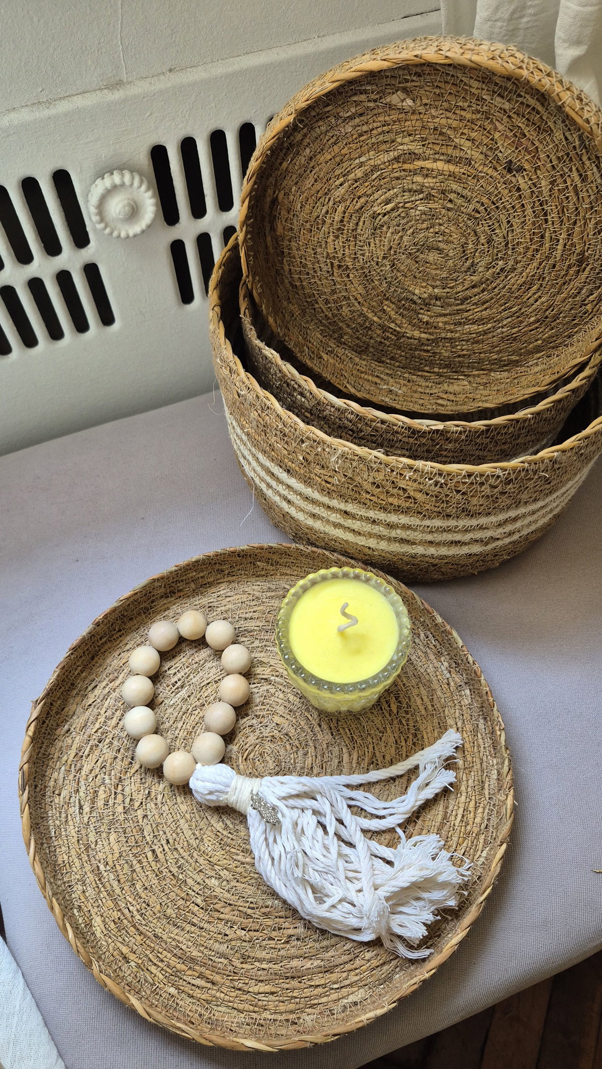 Usala como bandeja para armar un pequeño rincón deco con una vela, cuentas de madera o un objeto especial.