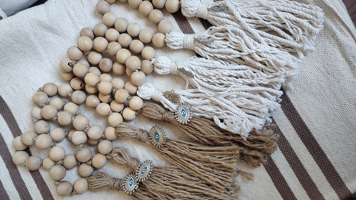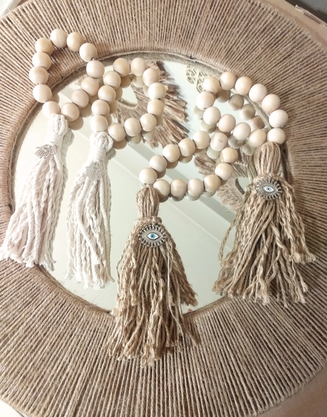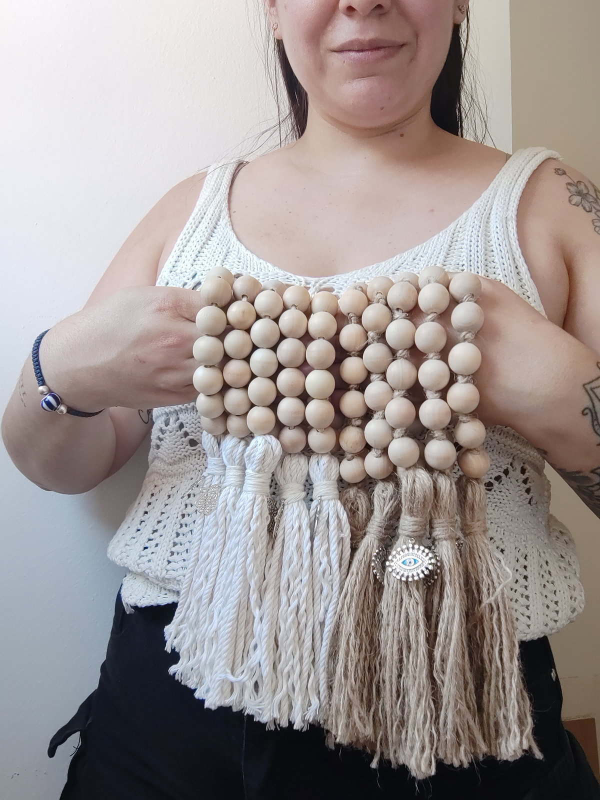 Borla De Yute y Algodon con cuencas de madera con detalles de Dije.